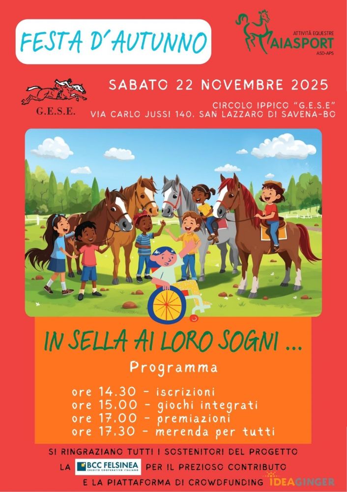 Sabato 22 novembre 2025 l'ASD AIASPORT APS, ospiterà in collaborazione con il Circolo Ippico G.E.S.E. di San Lazzaro di Savena la Festa d’Autunno, un evento speciale dedicato a bambini e a ragazzi speciali che