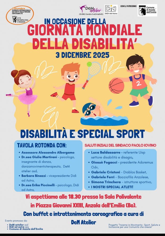 In occasione della Giornata Mondiale delle Persone con Disabilità, che si celebra il 3 dicembre, è inprogramma ad Anzola dell'Emilia l'iniziativa dedicata al tema “Disabilità e Special Sport”. L’evento, promosso da DeM Atelier ASD, Didi ad astra APS e patrocinato dal Comune di Anzola dell’Emilia, rappresenta un importante momento di dialogo, sensibilizzazione e festa.