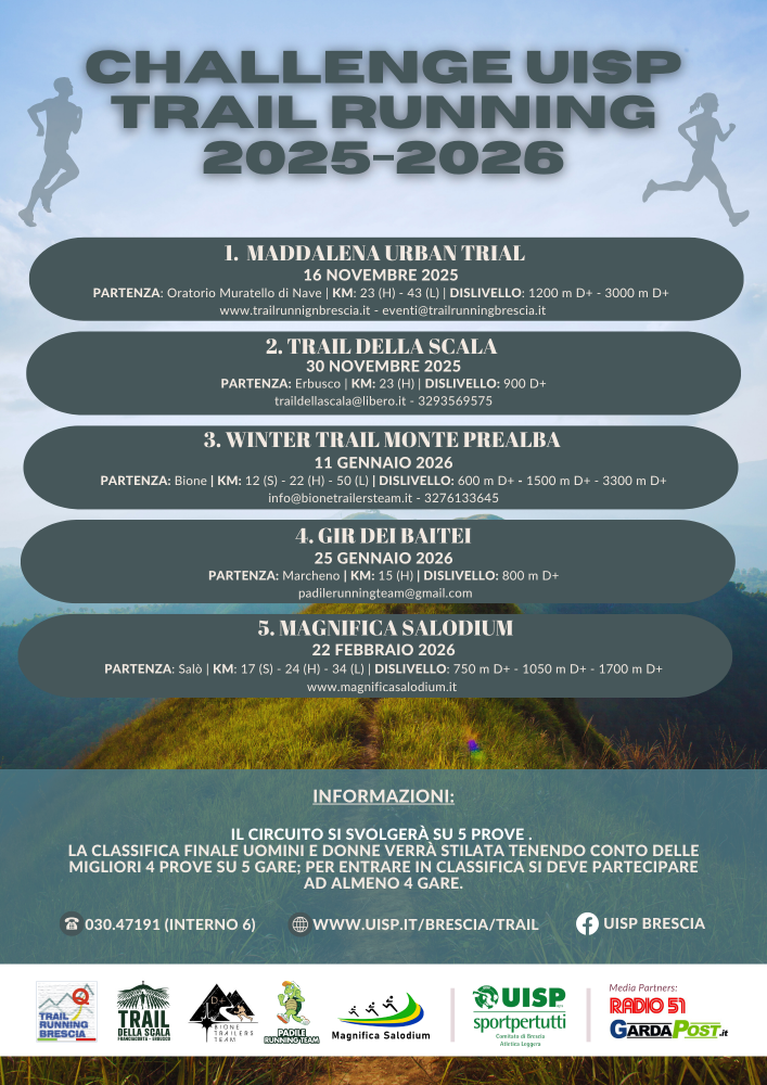 A novembre prenderà il via la nuova edizione del Challenge UISP Trail Running, l'edizione 2025/2026 del circuito di gare di trail running invernale-primaverile targato UISP Brescia.