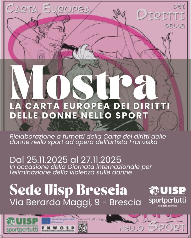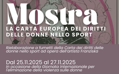 Dal 25 al 29 novembre, nel salone della sede di via Berardo Maggi, sarà allestita la mostra dedicata alla Carta Europea dei Diritti delle Donne nello Sport: un percorso illustrato che, attraverso le tavole della “CartaFumetto”, racconta in modo semplice e diretto i principi di parità, tutela e inclusione nello sport.