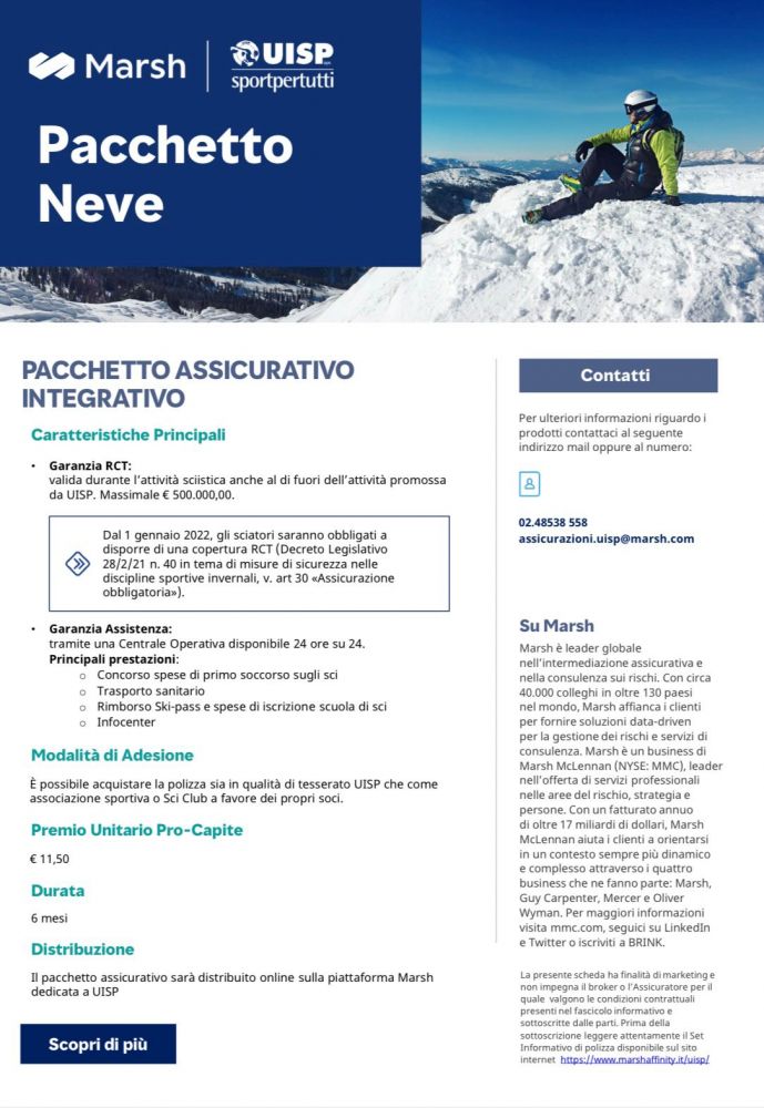 Premesso che i tesserati Uisp godono già automaticamente di tale garanzia assicurativa in occasione delle attività svolte nell’ambito associativo, il “Pacchetto Neve” Uisp-Marsh, prevede una garanzia RCT, obbligatoria per legge a partire dal 1° gennaio 2022 (in virtù dell’art. 30 «Assicurazione obbligatoria» del Decreto legislativo 28 febbraio 2021, n. 40 (Attuazione dell'articolo 9 della legge 8 agosto 2019, n. 86, recante misure in materia di sicurezza nelle discipline sportive invernali), che tutela l'assicurato per eventuali danni arrecati a terzi nello svolgimento dell'attività sciistica, anche al di fuori delle attività promosse dalla Uisp e dalle affiliate.
