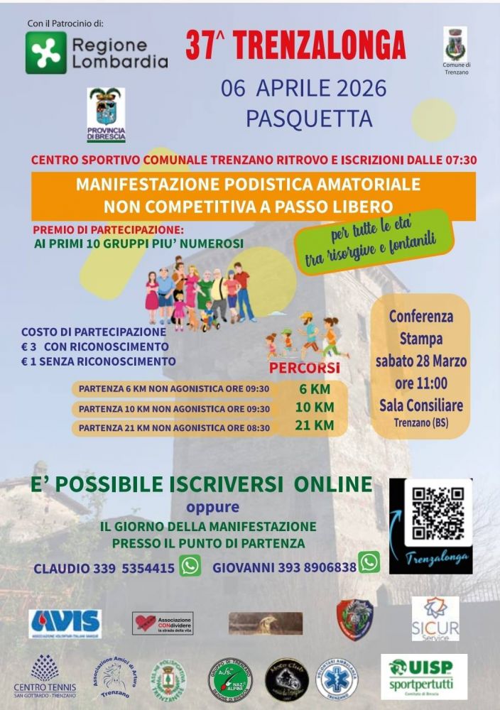 Appuntamento con lo sport per tutti lunedì 6 aprile 2026 a Trenzano, dove torna la 37ª edizione della “Trenzalonga”, storica manifestazione podistica non competitiva aperta a tutte le età. Un evento che unisce movimento, socialità e valorizzazione del territorio, in programma come da tradizione nel giorno di Pasquetta.
