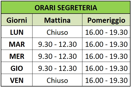 L'Ufficio di Segreteria (per affiliazioni, ritiro tessere, pagamenti, richieta certificazioni) è aperto dal lunedì al venerdì nei seguenti orari: