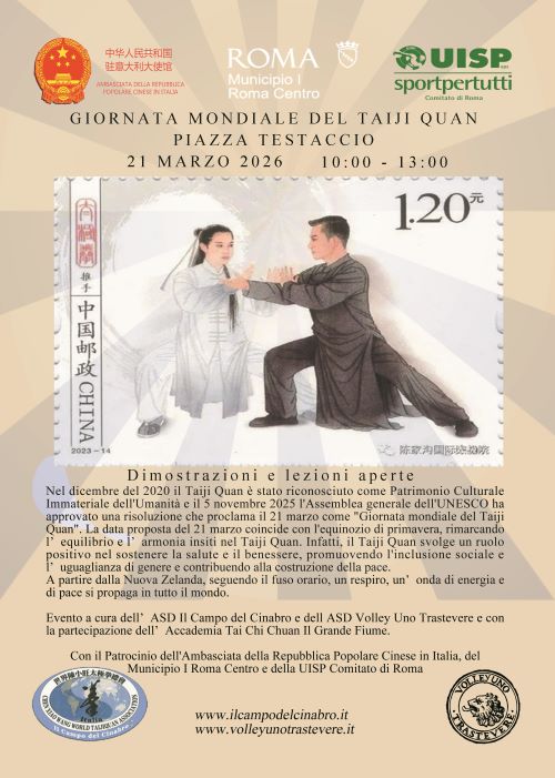 LAZIO Sabato 21 marzo ore 10:00-13:00 Piazza Testaccio – Roma. A cura di: ASD Il Campo del Cinabro e la partecipazione dell’Accademia Tai Chi Chuan Il Grande Fiume. Questo evento ha ottenuto il patrocinio dell’Ambasciata della Repubblica Popolare Cinese.