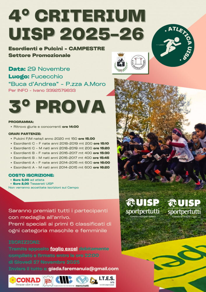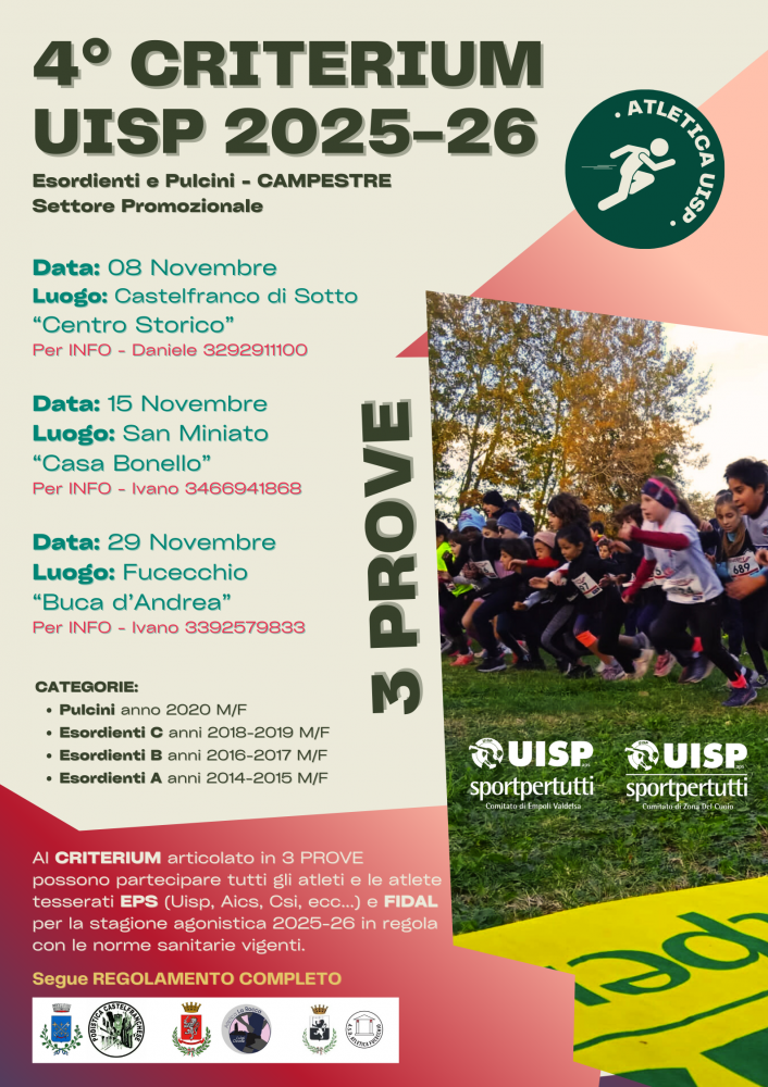 La quarta edizione del Criterium Uisp prevede tre gare di corsa campestre, suddivise per categorie, a cui potranno prendere parte pulcini ed esordienti nati dal 2014 al 2020.