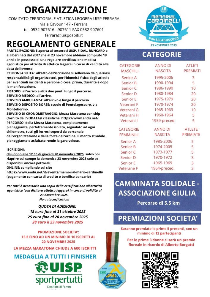 ONLINE: compilando il modulo al link per tutti e' necessaria copia della certificazione all'attività agonistica (con dicitura atletica leggera) in corso di validità al 23 Novembre 2025. NO AUTOCERTIFICAZIONI.
