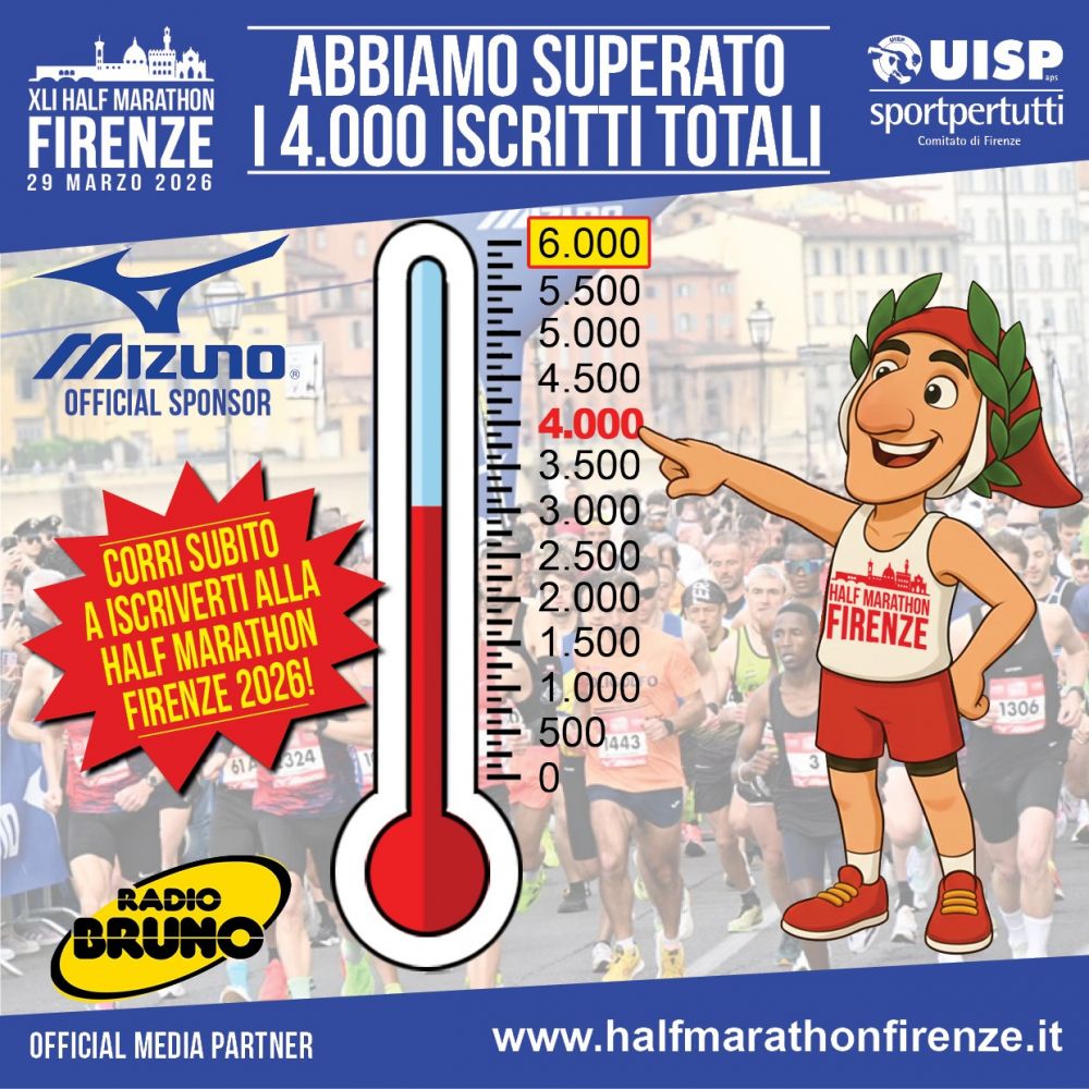 Si va verso un clamoroso sold out con molte settimane di anticipo. Le iscrizioni alla Half Marathon Firenze 2026 del prossimo 29 marzo 2026 hanno già superato la barriera dei 4000 iscritti. Per la precisione 4350 iscritti complessivi di cui 3850 per la Half Marathon Firenze e gli altri per la non competitiva di oltre 10 km (11,5 km per la precisione).