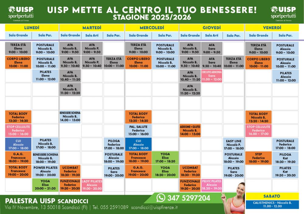 La Palestra Uisp di Scandicci offre sei diverse sale a disposizione per gli amanti del benessere: Sala Grande, Sala Arti marziali, Sala Parquet, Sala Work Station, Sala Yoga e Sala Fitness, dedicate alle diverse attività e corsi.