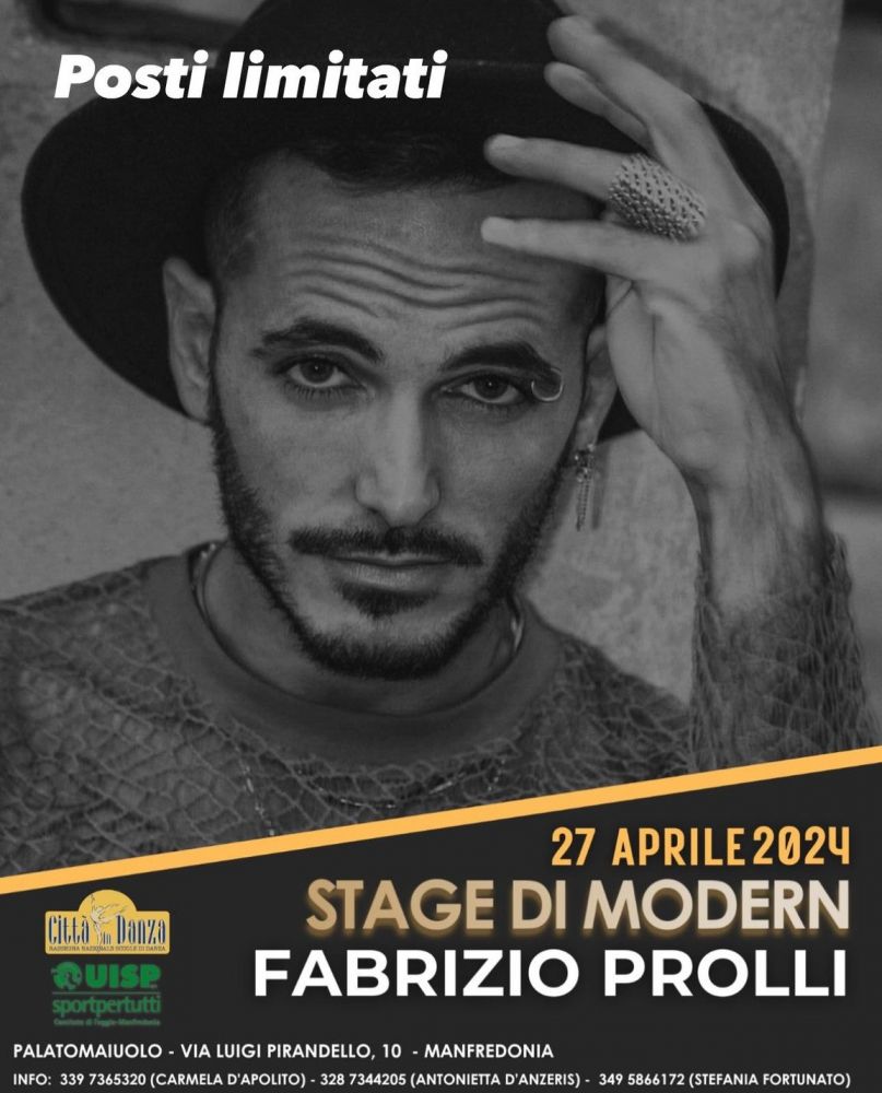 Per questa edizione è prevista la possibilità per i ballerini di perfezionarsi frequentando lo stage di modern che si terrà sabato 27 aprile 2024 con il grande Fabrizio Prolli.