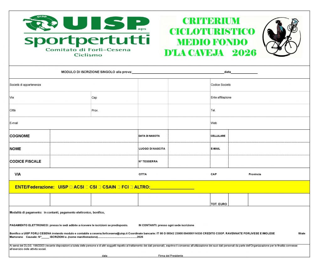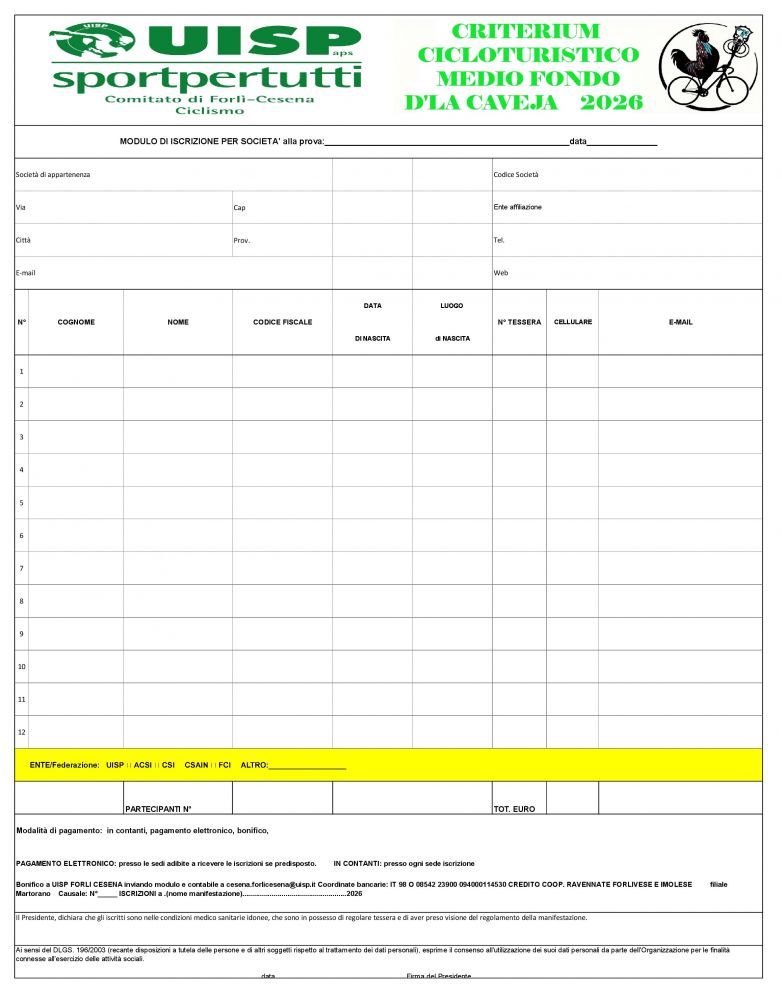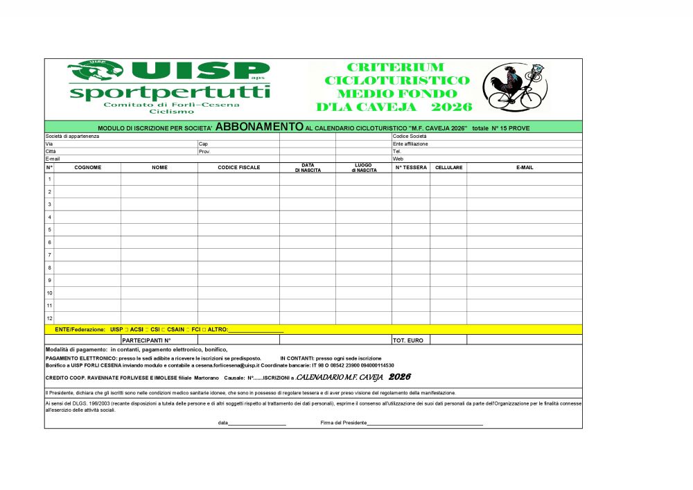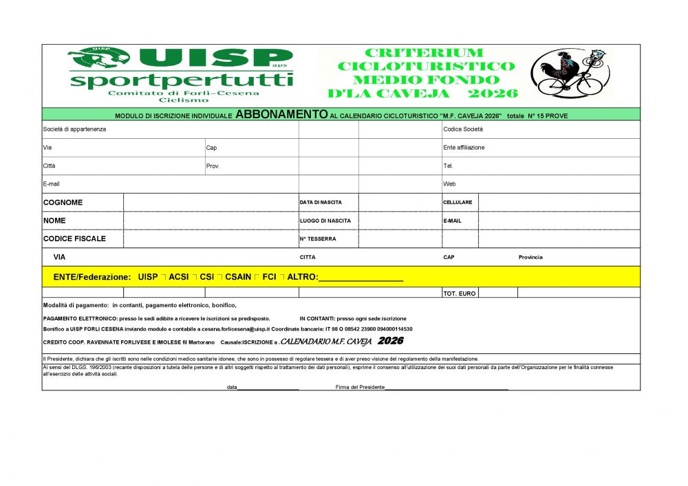 MODULI DI ISCRIZIONE INDIVIDUALI E ABBONAMENTI AL CALENDARIO CICLOTURISTICO "M.F. CAVEJA 2026" EXCEL |