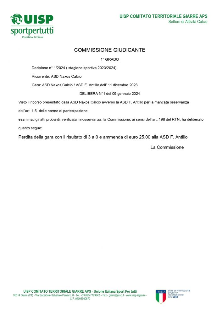 COMUNICATO NR. 1 DEL 07/12/2023