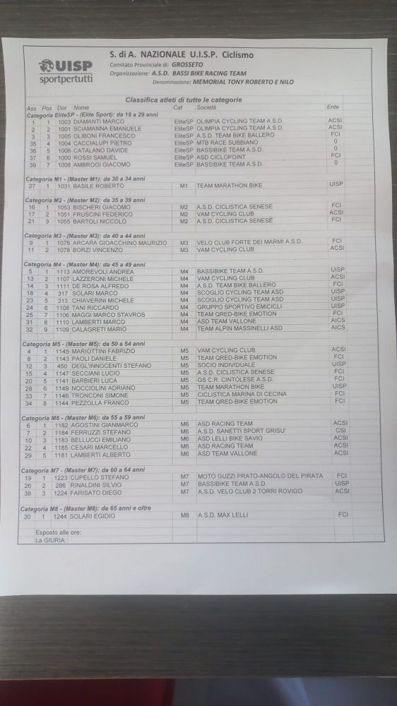 I vincitori per ogni categoria hanno visto primeggiare Marco Diamanti dell’Olimpia Cycling Team (Elite Sport), Roberto Basile del Team Marathon Bike (M1), Giacomo Bischeri della Ciclistica Senese (M2), Maurizio Gioacchino Arcara del Velo Club Forte dei Marmi (M3), Andrea Amorevoli del Bassibike Team (M4), Fabrizio Mariottini del Vam Cycling Club (M5), Gianmarco Agostini del Racing Team (M6), Stefano Cupello del Moto Guzzi Prato (M7) ed Egidio Solari del Max Lelli (M8).