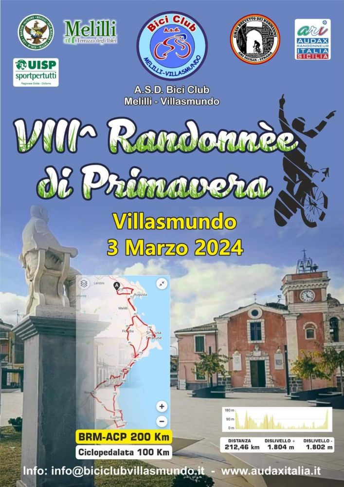 Domenica 3 Marzo si svolgerà con partenza da Villasmundo la Randonnèe di Primavera, giunta alla 8° edizione e organizzata dalla Biciclub Villasmundo Società storica della Uisp Sicilia e S.d.A. Ciclismo, a cui parteciperanno ciclisti provenienti da molte Province della Sicilia e anche da Regioni oltre lo stretto. I percorsi della Randonnèe sono due 100 Km e 200 Km i partecipanti del percorso lungo partendo da Villasmundo attraverseranno i comuni di Priolo, Floridia, Cassibile, Avola, Noto, Rosolini, Pachino, Portopalo di Capo Passero punta più meridionale dell’isola, per poi ritornare a Villasmundo toccando i comuni di Marzamemi, Calabernardo, Avola, Cassibile, Siracusa, Priolo con arrivo a Villasmundo dove riceveranno un diploma di partecipazione e un gustoso pasta party.