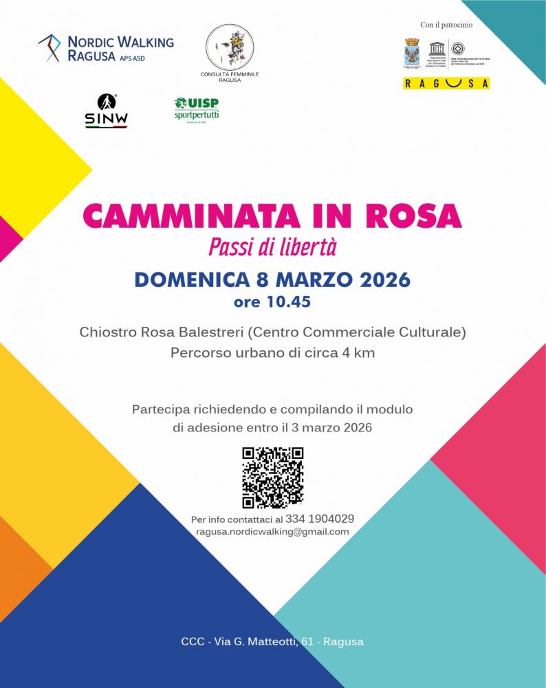 In occasione della festa della donna, si terrà a Ragusa, giorno 8 marzo 2026, con partenza alle ore 10.45 dal chiesto Rosa Balestrieri (CCC di via Matteotti 61), la "Camminata in Rosa", su un percorso urbano di circa 4 km