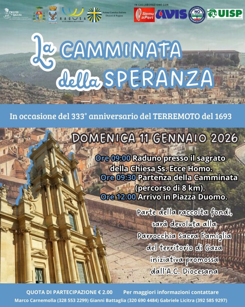 Domenica 11 gennaio 2026, per l’organizzazione la Diocesi di Ragusa - Ufficio pastorale del tempo libero, turismo e sport in collaborazione con “ASD Siemu a Peri”, Comitato UISP Iblei, Avis di Ragusa e Asd NO al doping di Ragusa intendono promuovere l’evento di cui sopra.