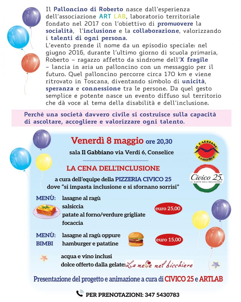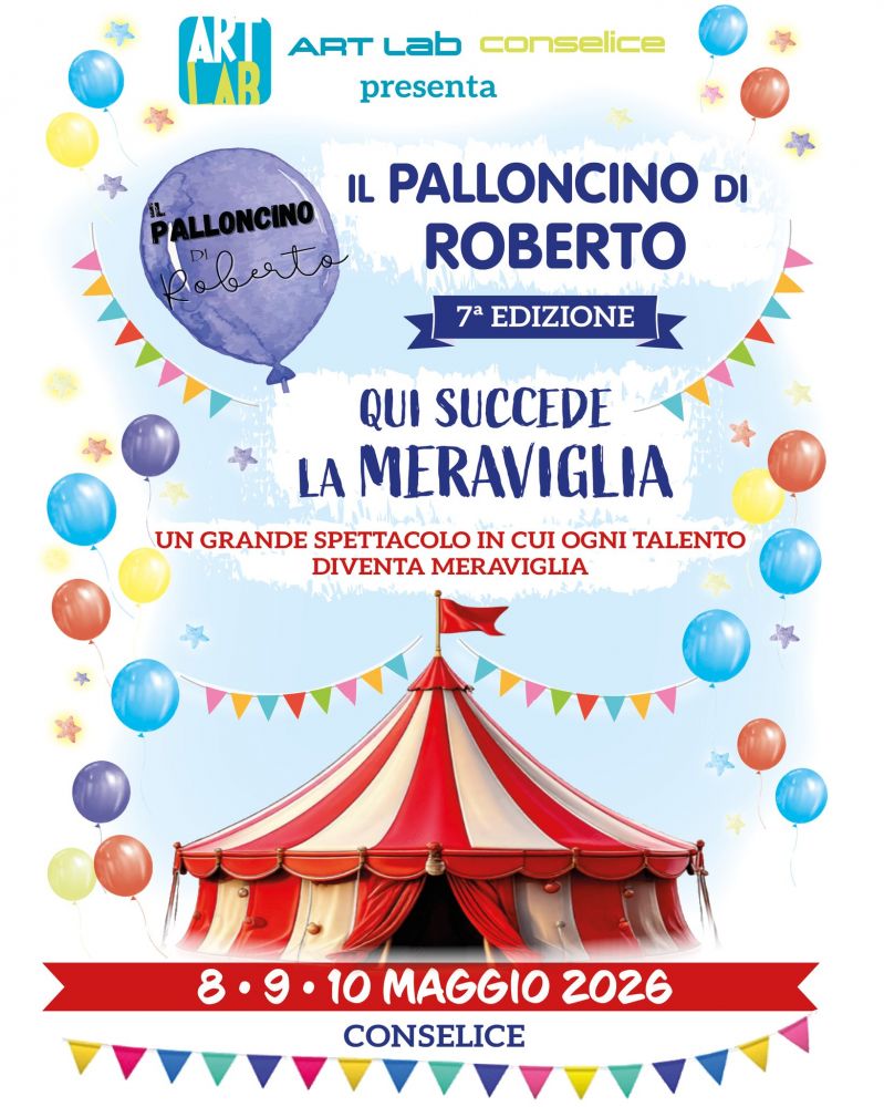 Dall’8 al 10 maggio 2026 Conselice ospita la settima edizione de “Il Palloncino di Roberto”, iniziativa promossa da ART LAB Conselice che negli anni è diventata un appuntamento riconosciuto sul territorio per il valore sociale, educativo e inclusivo. Un evento di partecipazione e riflessione, mettendo al centro proprio il tema dell’inclusione.