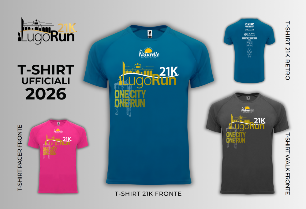 Accanto alla maglia ufficiale della 21K, sono previste anche le t-shirt dedicate alle diverse componenti della manifestazione con la conferma, dopo il successo della proposta degli scorsi anni, di una maglia per gli iscritti alla LugoRunWalk, per chi vorrà portare a casa un ricordo della manifestazione. Per la ludico-motoria la t-shirt sarà grigio piombo scuro, i pacer impegnati ad animare la corsa ne indosseranno una versione color fucsia e, infine, sarà turchese quella per i componenti dello staff e i volontari che si muoveranno nell’area del centro storico, tra il Pavaglione e le piazze circostanti. Su tutte le versioni delle maglie, alcuni dei principali sponsor in evidenza, ovvero Naturelle, Edilpiù , TIMIAMA Lugo e Zinc-Crom