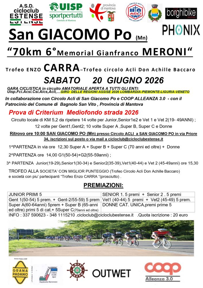 Pubblichiamo modalità di iscrizione ai prossimi appuntamenti del calendario ciclistico in provincia di Mantova