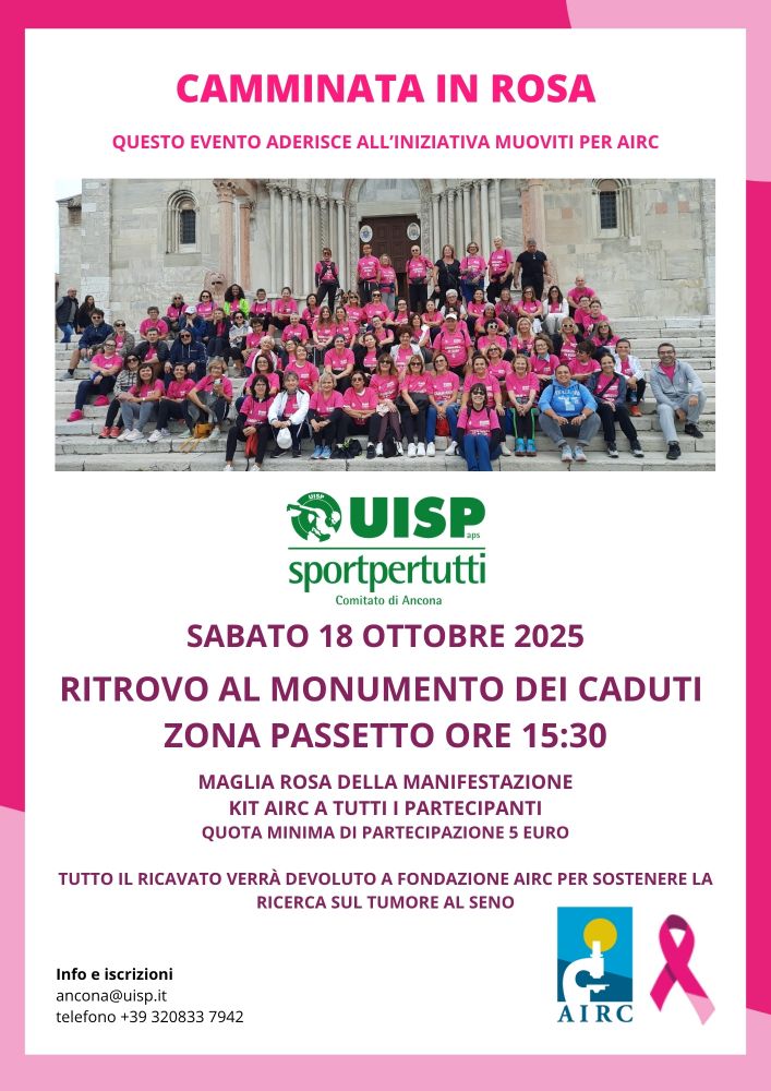 Sabato 18 ottobre UISP Ancona e l’Ufficio Regionale Marche di Fondazione AIRC organizzano la Camminata in Rosa, una iniziativa rivolta a sostenere la ricerca sul Tumore al seno.