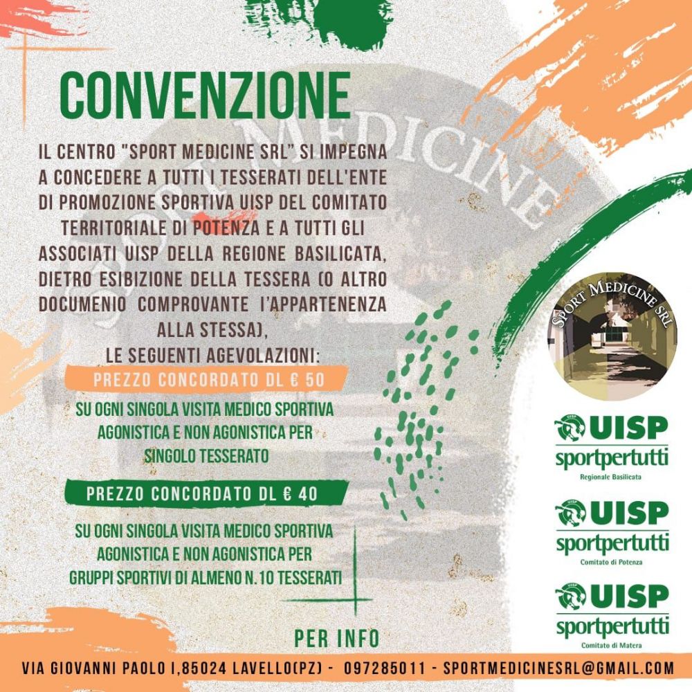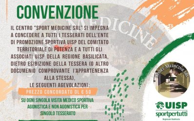 ll Centro "Sport Medicine SRL” si impegna a concedere a tutti i tesserati dell'Ente di Promozione Sportiva UISP del Comitato Territoriale di Potenza e a tutti gli associati UISP della Regione Basilicata, dietro esibizione della tessera (o altro documenio comprovante I’appartenenza alla stessa), le seguenti agevolazioni: