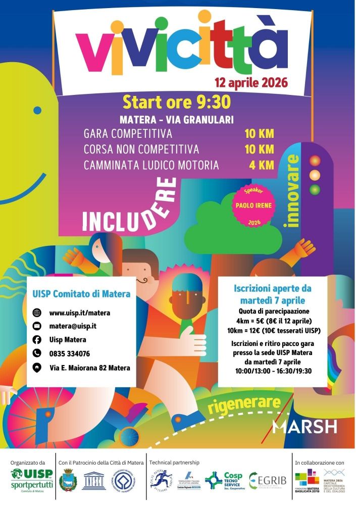 Domenica 12 aprile Matera accoglie una nuova edizione di Vivicittà, la storica manifestazione UISP che torna ad animare le strade della città con partenza alle ore 9:30 da via Granulari, confermandosi come uno degli appuntamenti più attesi da chi vive lo sport non solo come pratica, ma come momento di condivisione e partecipazione. A raccontarne lo spirito sarà ancora una volta la voce di Paolo Irene, speaker dell’evento da circa dieci anni, che spiega: “è un’occasione di condivisione e convivialità, da vivere all’aperto, lontano dai social, riscoprendo il piacere dell’aria fresca, del contatto con la natura e delle relazioni autentiche”. Il Vivicittà rappresenta infatti un punto di riferimento importante per la città, capace di coinvolgere sia chi pratica sport con continuità sia chi vi si avvicina più sporadicamente, diventando anche simbolicamente l’inizio della bella stagione e un’occasione per riappropriarsi degli spazi urbani. Il percorso di quest’anno, completamente rinnovato, parte da via Granulari e si sviluppa attraversando zone meno centrali, in una scelta che mette al centro le persone e i quartieri: “La città non si limita al singolo centro, ma è fatta di luoghi in cui le persone vivono, crescono, lavorano. Questo percorso abbraccia tutto questo”.