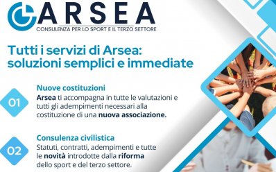 ARSEA Srl è la società di assistenza e consulenza in materia giuridico, contabile e fiscale nata nel 2001 per rispondere alle necessità delle organizzazioni senza scopo di lucro per volontà dell'UISP Emilia Romagna e dei suoi Comitati territoriali. Per maggiori informazioni sui servizi offerti visita il sito www.arseasrl.it.
