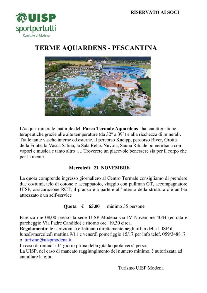 Avete bisogno di una giornata rilassante alle terme? Volete trascorrere qualche giorno tra le meraviglie di Puglia e Basilicata? Vi manca una vacanza approfondita tra gli scavi della Roma classica? Oppure volete festeggiare il Capodanno in Campania, ammirando alcuni gioielli artistici e naturali della nostra penisola? Il settore Turismo Uisp Modena ha tutto quello che fa per voi per un autunno ricco di iniziative: si parte mercoledì 17 ottobre con la gita alle terme di Sirmione, si arriva fino a Capodanno col sogiorno organizzato a Salerno. Ecco di seguito tutti i volantini esplicative delle proposte turistiche Uisp, riservate ai soci.