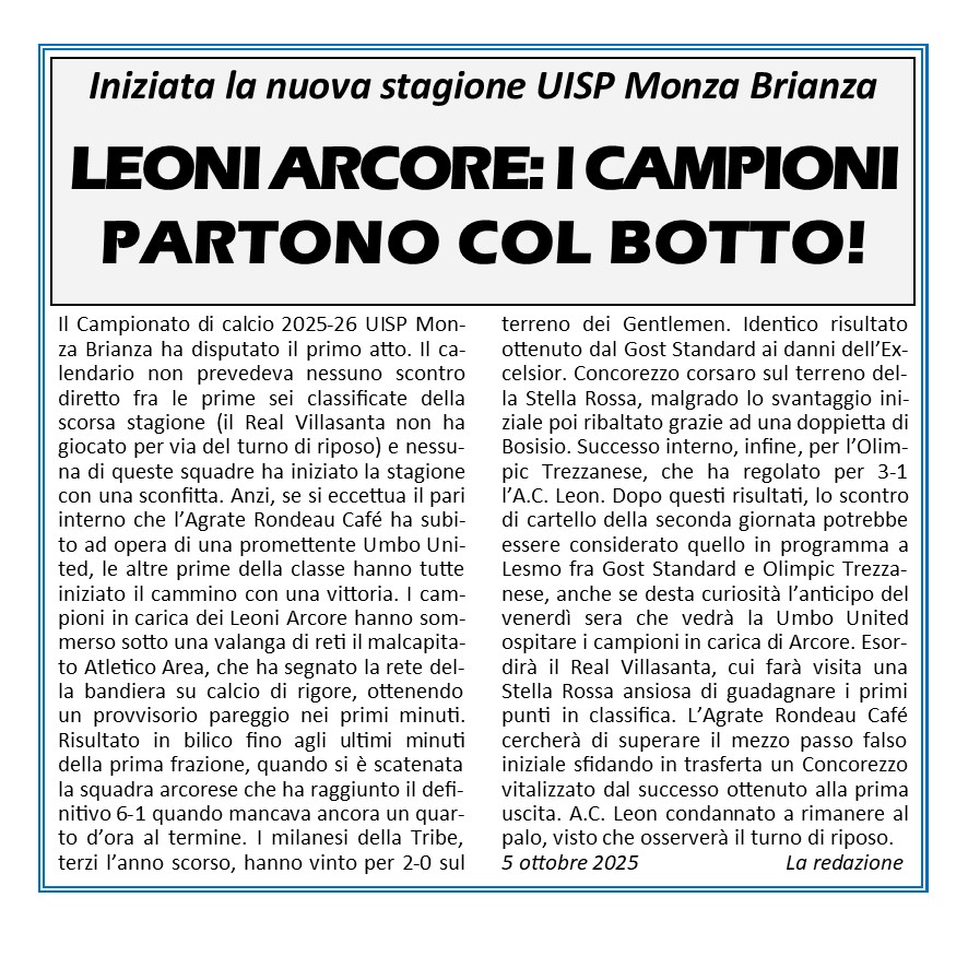 La partita UMBO UNITED – A.S.D. EXCELSIOR 1995, relativa alla 4a giornata, si giochera’ MARTEDI’ 21 OTTOBRE 2025 alle h.21:15, sul campo in erba di CINISELLO BALSAMO, Via dei Lavoratori 27 ________________________________________________________________________ ________________________________________________________________________ ________________________________________________________________________