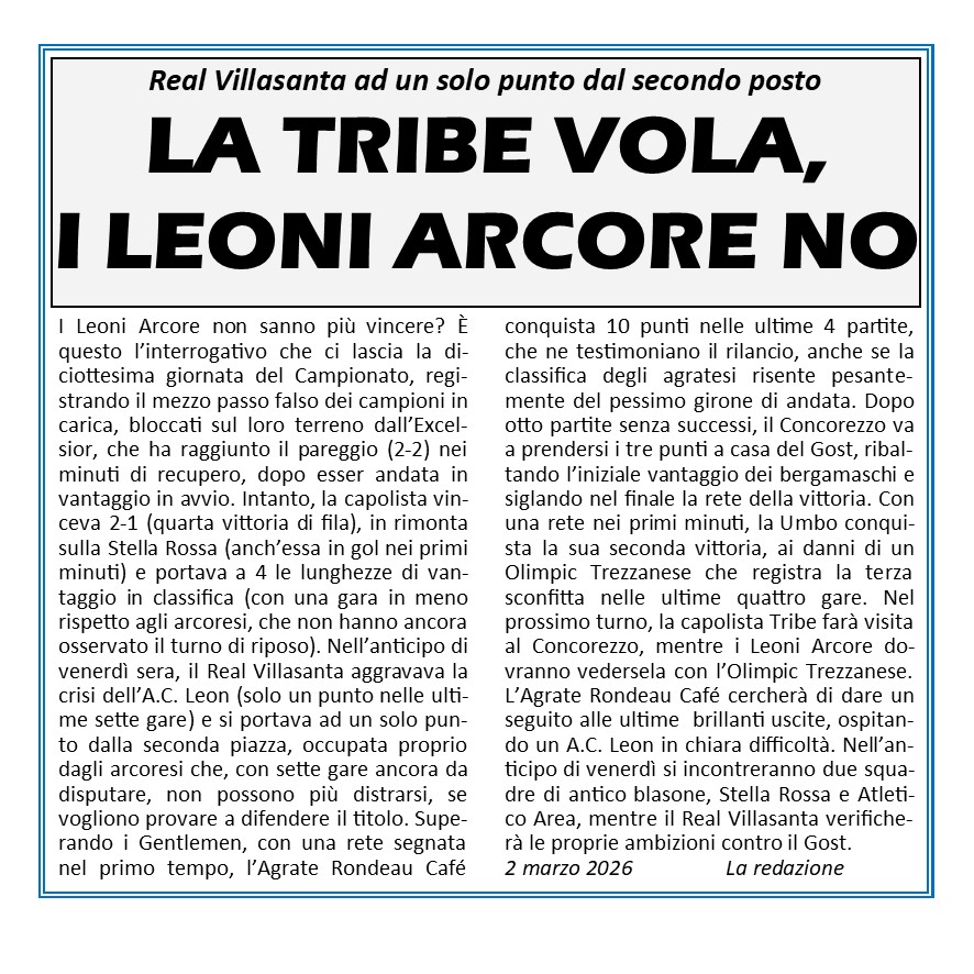 e si giochera' sul campo sintetico di VILLASANTA.