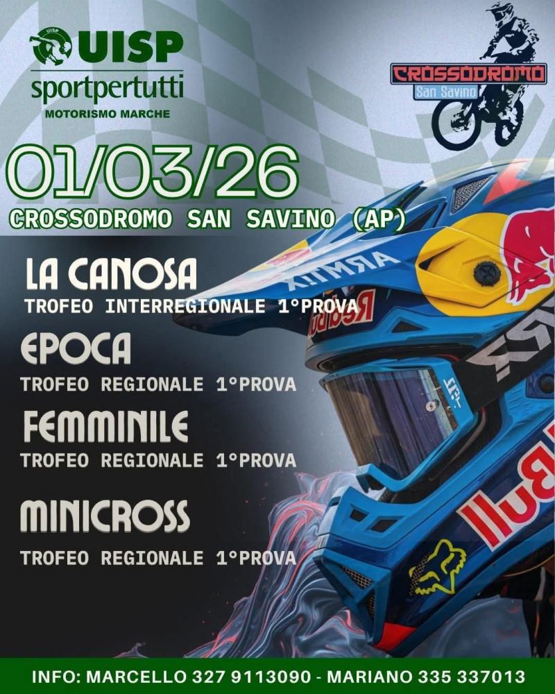 | 01/03/2026 | CROSSODROMO SAN SAVINO (AP) TROFEO INTERREGIONALE 1^ PROVA TROFEO REGIONALE EPOCA 1^ PROVA TROFEO REGIONALE FEMMINILE 1^ PROVA TROFEO REGIONALE MINICROSS 1^ PROVA ![]() |