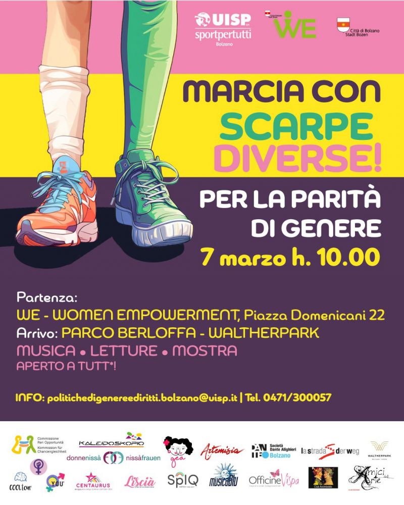 Anche Uisp Bolzano cammina per la parità di genere sabato 7 marzo ore 10 con la “Marcia con scarpe diverse”: l’iniziativa si svolge in occasione della Giornata internazionale della donna. L’obiettivo è richiamare l’attenzione sulle disuguaglianze che esistono ancora tra uomini e donne con il sostegno del Comune di Bolzano e la collaborazione di diverse associazioni del territorio. I partecipanti sono invitati ad indossare scarpe spaiate, cioè diverse tra loro. È un gesto semplice ma simbolico: rappresenta le differenze e le disparità che ancora oggi molte donne vivono nella vita quotidiana, nel lavoro e nella società.