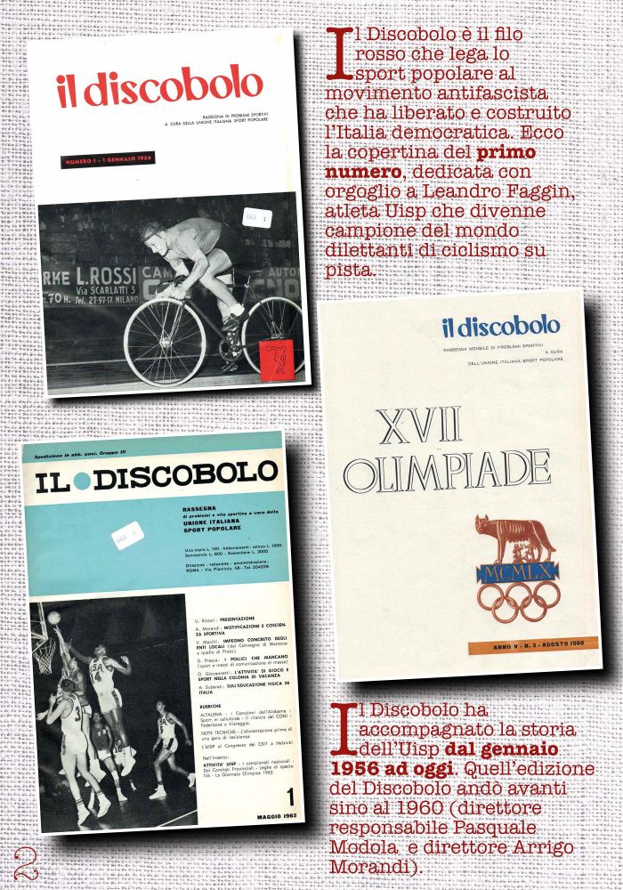 Il Discobolo compie 60 anni: informazione sportiva contromano, dalla parte dei meno forti, dei più critici. Ma anche informazione tenace, sessant’anni non sono pochi per una testata. Significano almeno tre cose: un editore associativo, l’Uisp, che ha garantito continuità e libertà ai redattori e collaboratori, che nel corso degli anni si sono avvicendati. Poi: contenuti originali da trasmettere. Infine: un pubblico attento al quale parlare. Perché lo sport? Perché è un racconto popolare dell’Italia, perché è ricerca fisica di un nuovo linguaggio e di nuove storie. Il Discobolo, ovvero: ricerca di nuovi punti di vista, notizie, approfondimenti che altri media spesso sottovalutano o ignorano. E tante storie dello sport popolare, sociale e per tutti. II l Discobolo è il filo rosso che lega lo sport popolare al movimento antifascista che ha liberato e costruito l’Italia democratica.