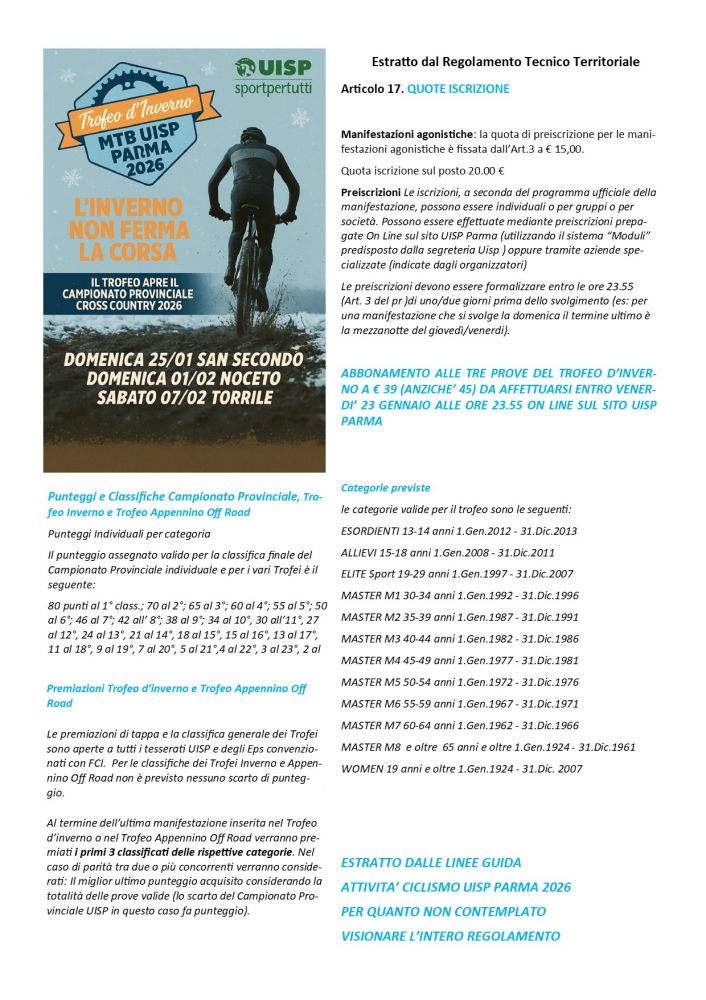 Appoggio bancario: IBAN IT29P0538765840000002166072 a favore di ASD Noceto Bike, indicando nella causale il nome dell'atleta iscritto, società di appartenenza e la dicitura "abbonamento Trofeo d'Inverno"