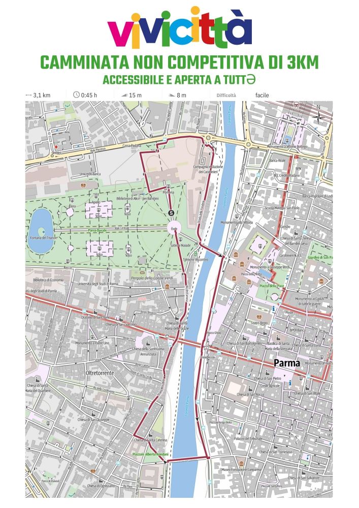 La camminata partirà dopo la corsa (indicativamente 9:35) sotto l'arco!Sono previsti due percorsi, uno da 6km che discende nel greto della Parma e percorre le vie dell'Oltretorrente e del centro storico e uno da 3km, accessibile a tutte le persone anche a coloro che hanno ridotta mobilità o necessità speciali. Il percorso da 3km è stato studiato insieme ad ANMIC ed è stato dagli stessi provato per assicurare la percorribilità a tutt*. Le iscrizioni alla camminata avvengono al banchetto UISP entro le 9:25. Possibilità di iscrizione con o senza acquisto della maglietta Vivicittà 2026! Il costo è di 3€ per la partecipazione alla camminata o di 5€ per la partecipazione e la meravigliosa maglietta di Vivicittà 2026! CLICCA QUI PER VEDERE IL PERCORSO DELLA CAMMINATA DA 6KM CLICCA QUI PER VEDERE IL PERCORSO DELLA CAMMINATA DA 3KM ADATTA A TUTTƏ Per la partecipazione alla camminata NON è richiesto |