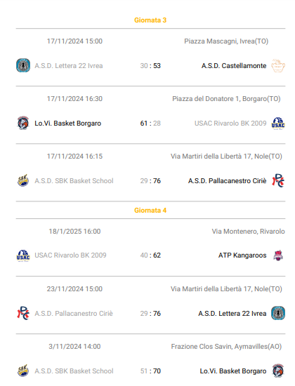 | 29/11/25 | A.S.D. Lettera 22 Ivrea | A.S.D. SBK Basket School Aosta | 56 | 44 |