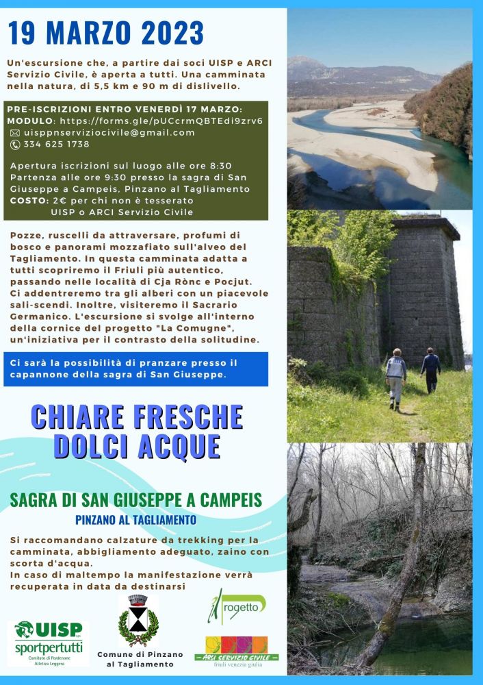 Domenica 19 marzo ci troviamo a Campeis per immergerci nel Friuli più autentico, tra boschi, ruscelli da attraversare e panorami mozzafiato sul Tagliamento. Durante camminata aperta a tutti visiteremo il sacrario germanico. Apertura iscrizioni alle 08:30, partenza alle 9:30 presso la sagra di San Giuseppe a Campeis di Pinzano al Tagliamento. Costo di partecipazione di 2€ per chi non è tesserato UISP o Arci Servizio Civile.