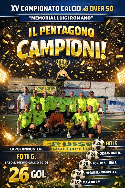 Si chiude con un finale emozionante il XV Campionato di Calcio a 8 Over 50 – Memorial Luigi Romano, che dopo 22 giornate intense ha incoronato il Pentagono campione.