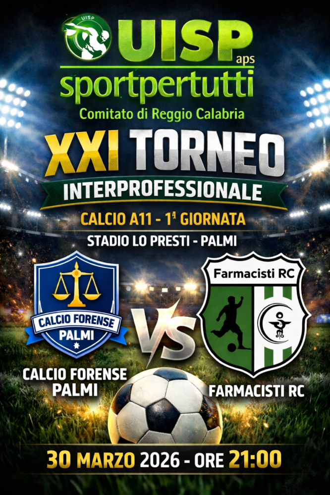 Inizia il 21^ Torneo Interprofessionale di Reggio Calabria targato UISP. Il più antico Torneo di calcio A11 vede in lizza le squadre dei Farmacisti di Rc, I Medici di Melito e il Calcio Forense di Palmi. Primo appuntamento Lunedi 30 alle ore 21,00 presso lo Satdio di Palmi.