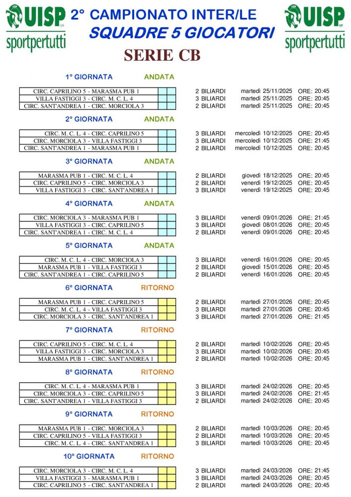 CAMPIONATO INTERPROVINCIALE A SQUADRE 5 giocatori SERIE C 2025/2026