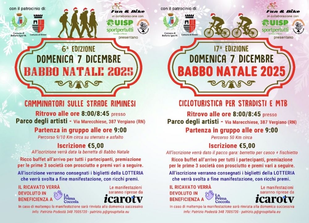 Ai partecipanti verrà consegnato il berretto da Babbo Natale, inoltre in contemporanea ci sarà la camminata con un percorso diverso a Rimini di 7/8 km presso il Parco degli Artisti, partenza in gruppo, al rientro ad attendere tutti quanti ci sarà un rinfresco.