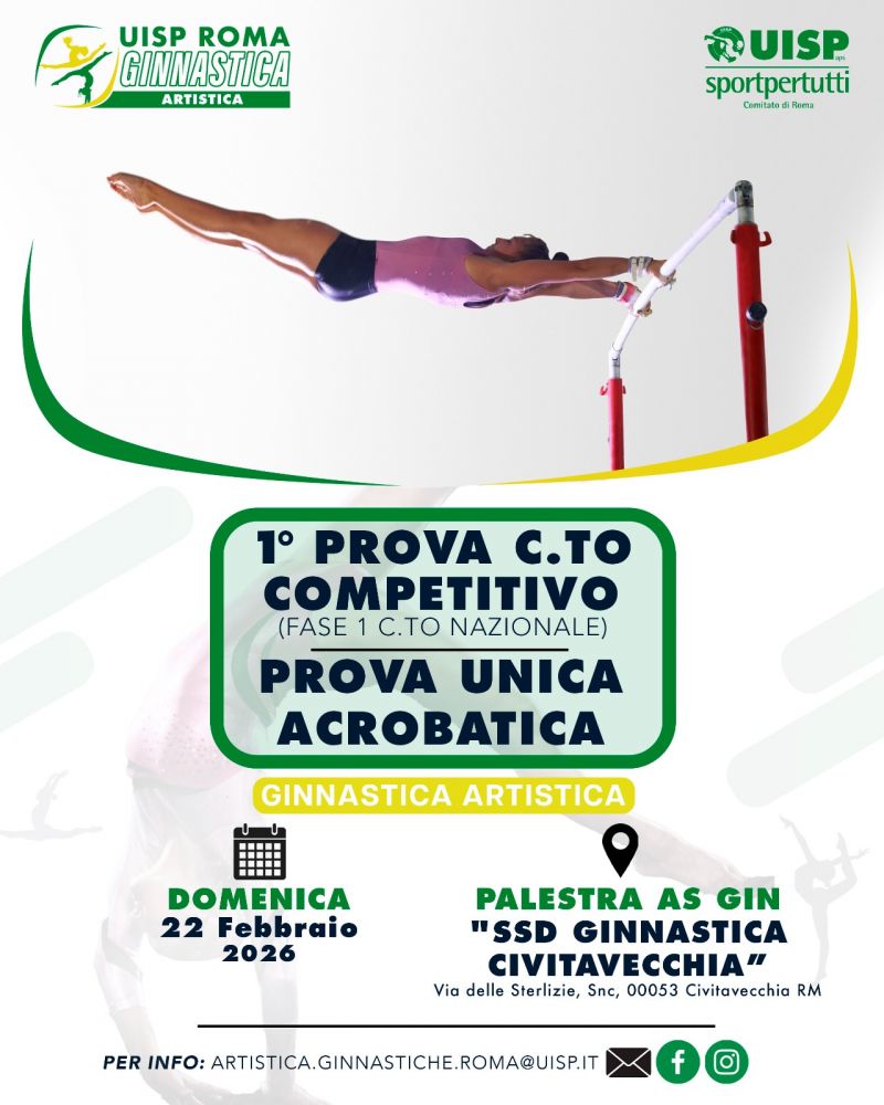 (RM), si svolgerà la Fase 1 del Campionato Nazionale UISP Categorie e Specialità di Ginnastica Artistica e la Prova Unica di Acrobatica.