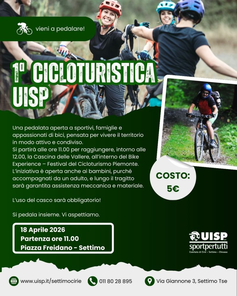 Sabato 18 aprile 2026 il Comitato UISP Ciriè – Settimo – Chivasso organizza la prima Cicloturistica UISP, un evento aperto a tutti gli amanti della bicicletta e del movimento all’aria aperta.