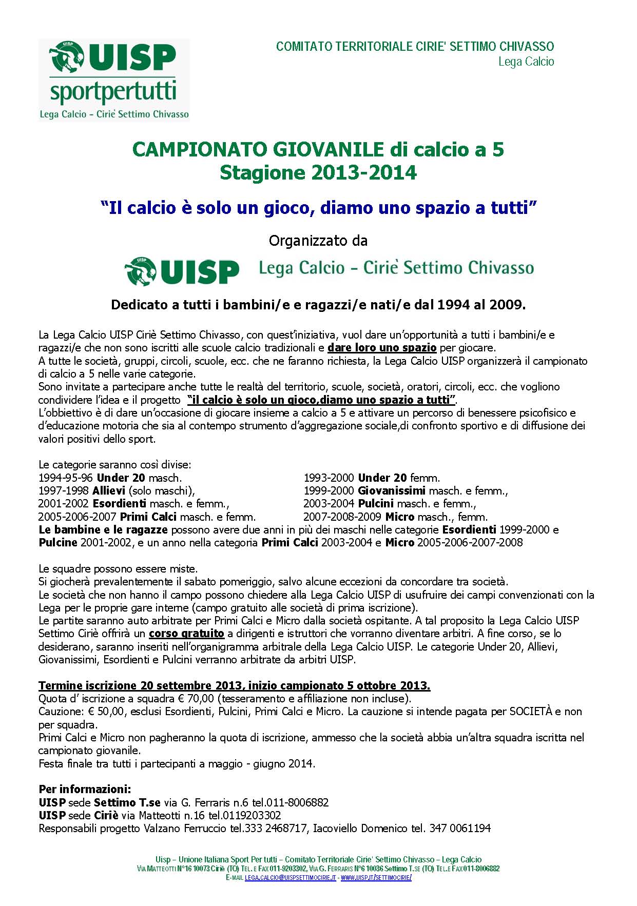 UISP sede Ciriè via Matteotti n.16 tel.0119203302