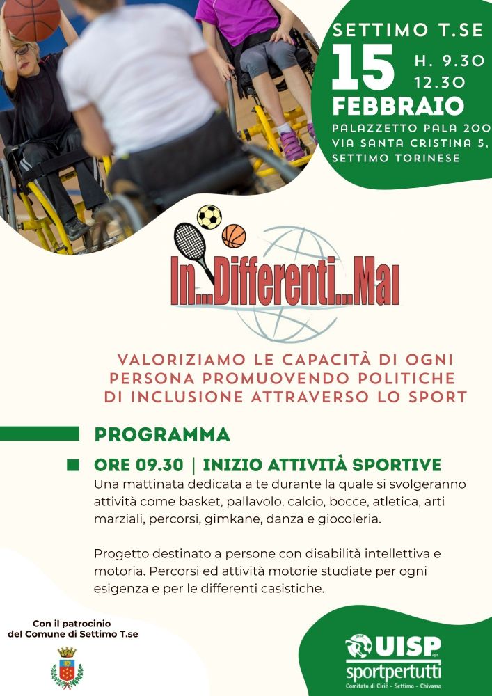 Con questo spirito sabato 15 febbraio arriva a Settimo Torinese una nuova tappa di In…Differenti…Mai, l’iniziativa promossa da UISP che mette al centro inclusione, partecipazione e comunità.