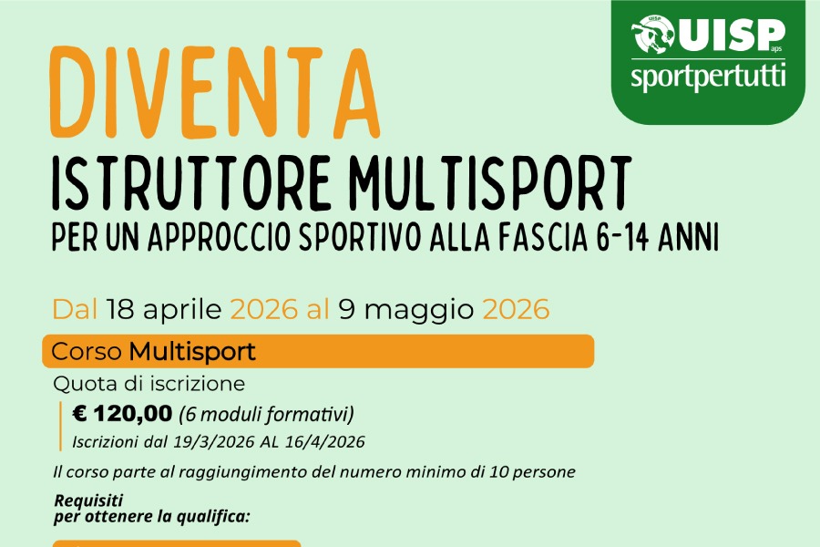 Dal 18 Aprile al 9 Maggio 2026, si svolgerà il corso "Diventa Istruttore Multisport per un approccio sportivo alla fascia 6-14 anni" organizzato dalla UISP.