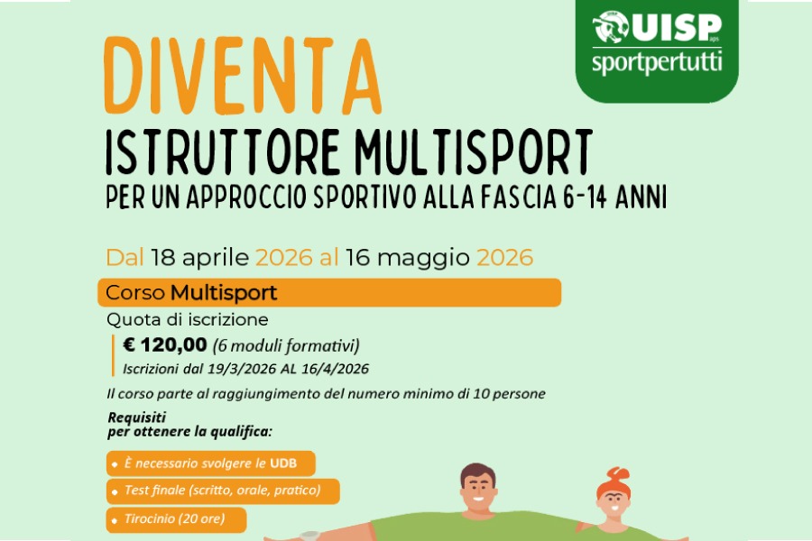 Dal 18 Aprile al 16 Maggio 2026, si svolgerà il corso "Diventa Istruttore Multisport per un approccio sportivo alla fascia 6-14 anni" organizzato dalla UISP.