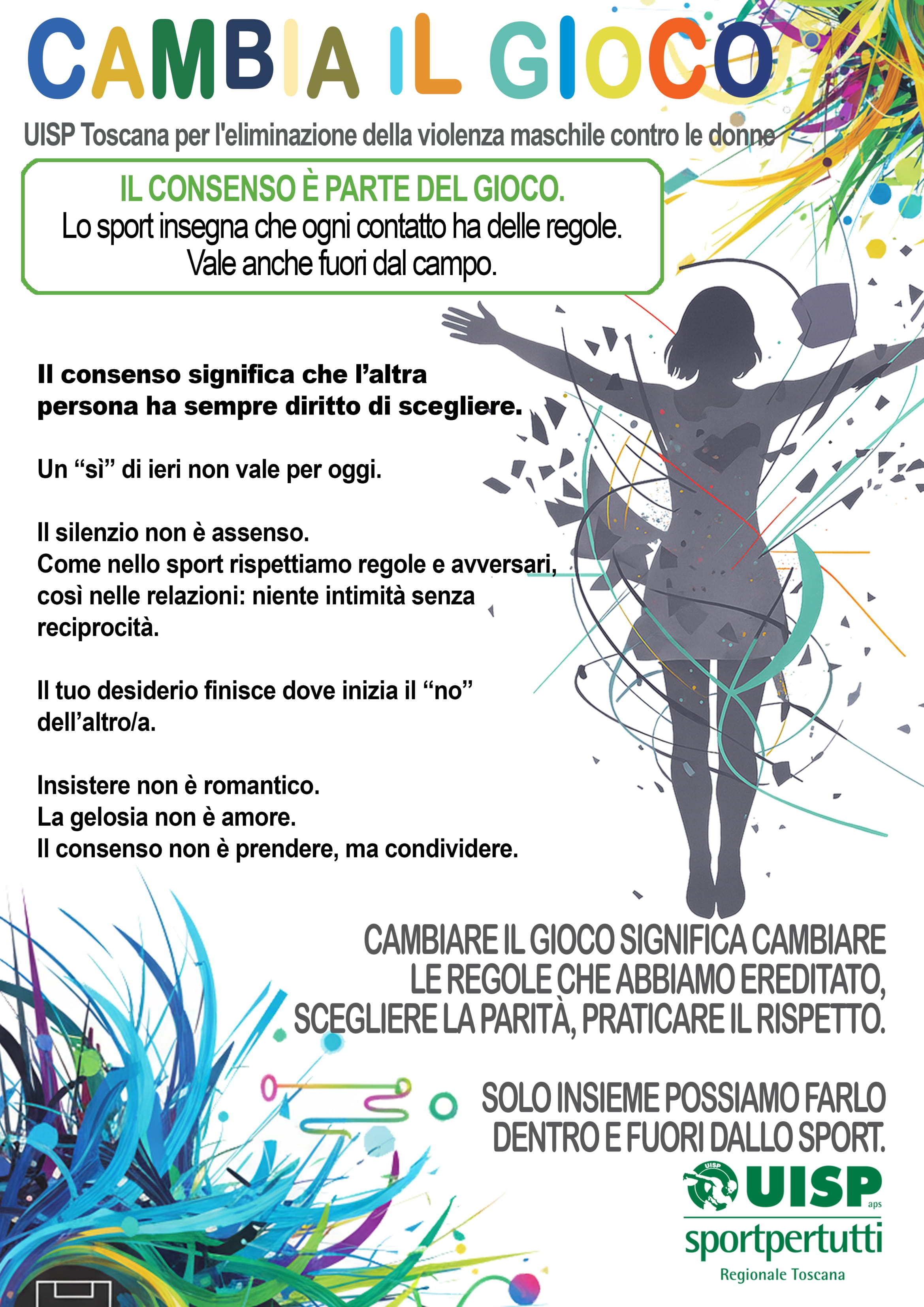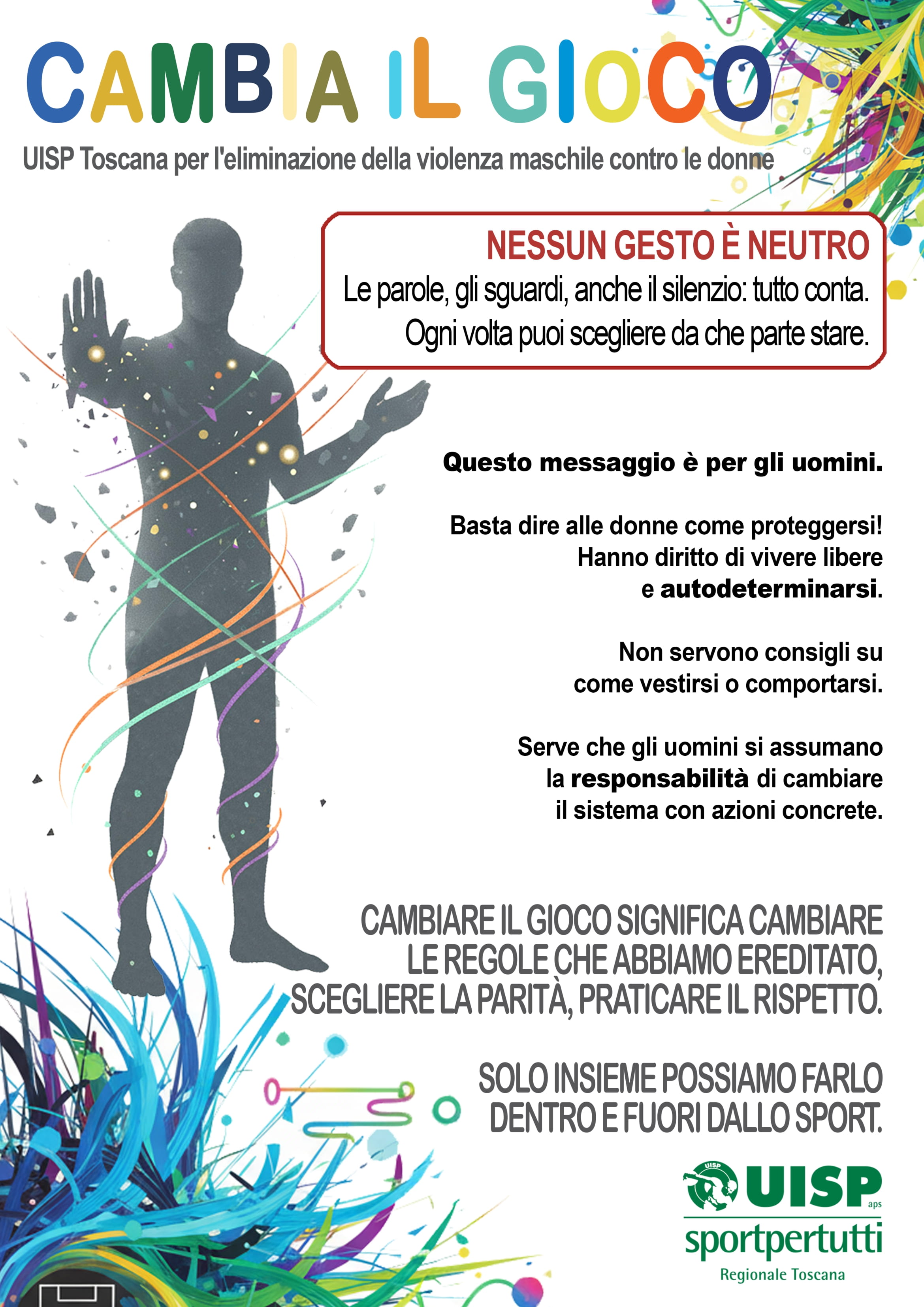 Uisp Toscana ha ideato cartelloni e una brochure informativa da affiggere e distribuire negli impianti sportivi che veicolano messaggi chiave fondamentali: riconoscere che nessun gesto è neutro, comprendere che l'educazione è il primo allenamento e praticare il consenso come parte del gioco. "Non chiediamo alle donne di proteggersi meglio. Chiediamo agli uomini di smettere di essere violenti - spiega Iurlaro - e iniziamo dall'educazione: quella che passa attraverso ogni allenamento, ogni spogliatoio, ogni momento di sport condiviso".