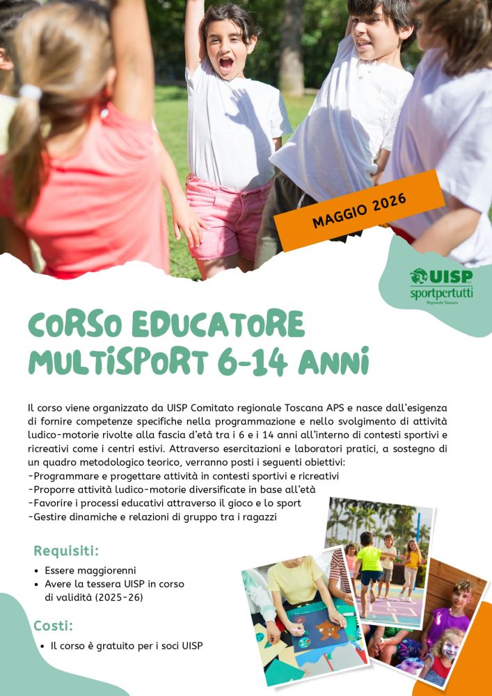 Uisp Toscana organizza nel mese di maggio il corso per educatore multisport rivolto alla fascia d’età 6-14 anni, un percorso formativo pensato per chi opera o intende operare in centri estivi, contesti sportivi e attività ricreative. L’obiettivo è fornire competenze teoriche e pratiche per programmare, progettare e condurre attività ludico-motorie adatte alle diverse età, con attenzione ai processi educativi, alla relazione di gruppo e alla crescita dei ragazzi.
