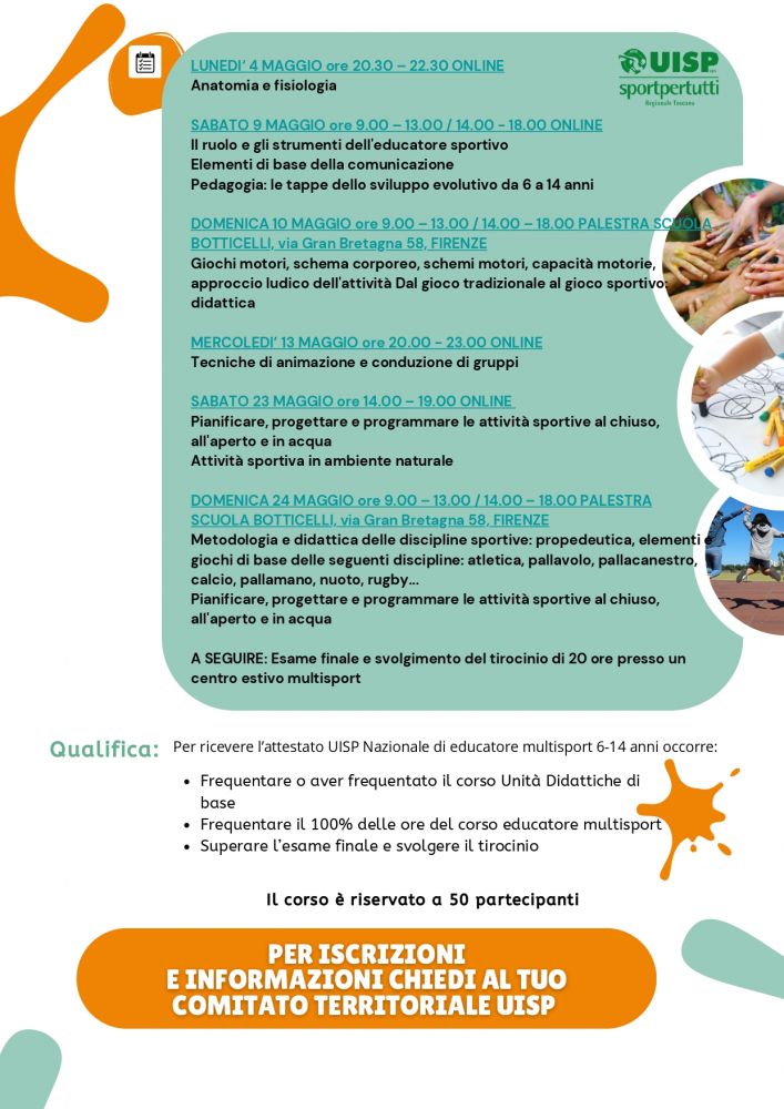 Le attività in presenza si svolgeranno alla palestra della scuola Botticelli, in via Gran Bretagna 58 a Firenze, mentre alcune lezioni saranno erogate online. Al termine del percorso sono previsti un esame finale e un tirocinio di 20 ore presso un centro estivo multisport, condizioni necessarie per ottenere l’attestato Uisp Nazionale di educatore multisport 6-14 anni.