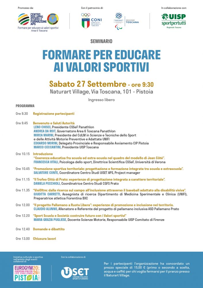 Uisp presente a 360 gradi all’interno del seminario di approfondimento dal tema “Formare per educare ai lavori sportivi” presso Naturart Village a Pistoia con il presidente di Uisp Toscana Marco Ceccantini che è stato tra coloro che hanno introdotto i lavori e Maria Grazia Lazzaro Pugliese, responsabile formazione di Uisp Firenze, che è stata tra i relatori trattando del tema “Sport, scuola e società, costruire futuro con i valori sportivi”.